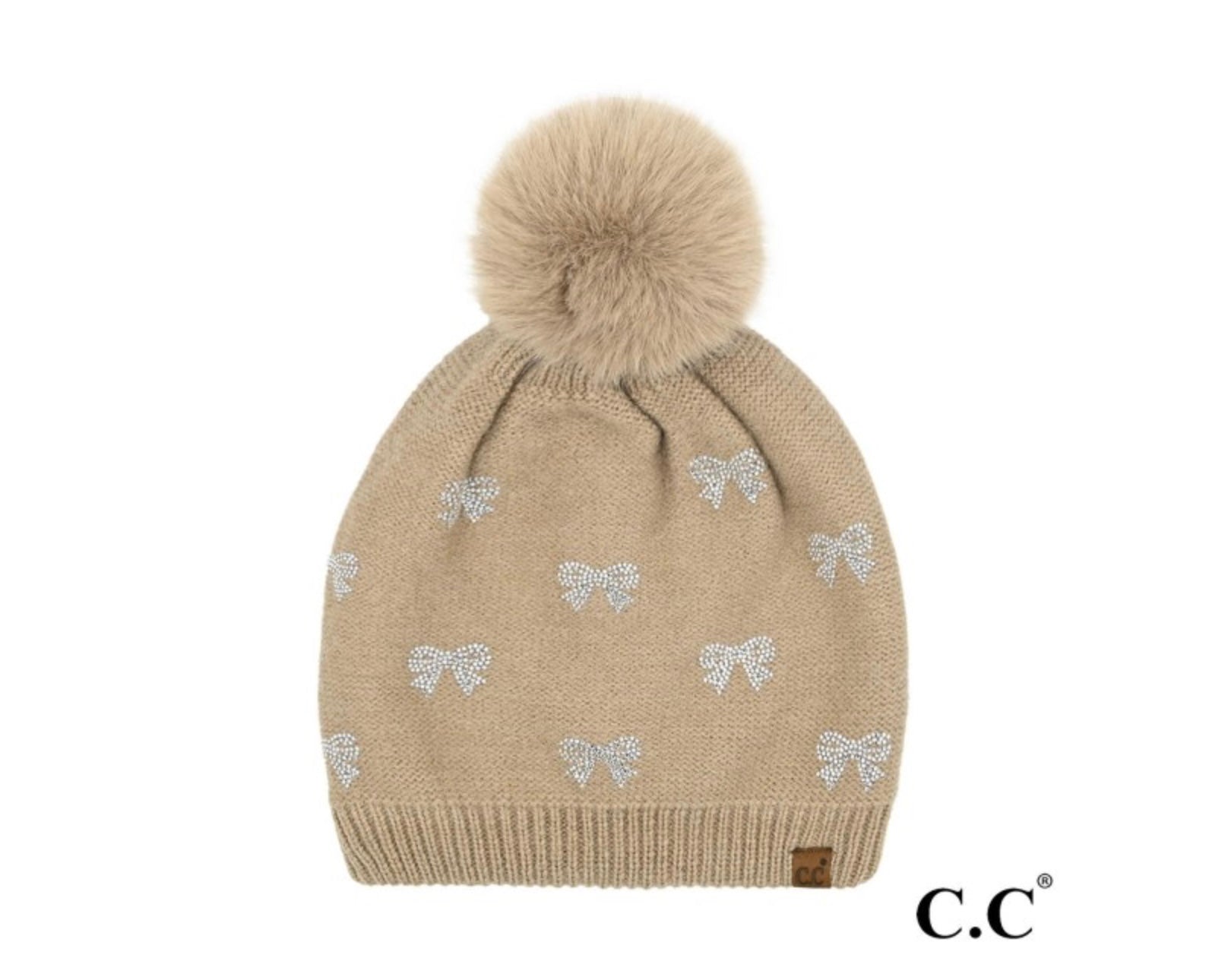 Upgrade your winter wardrobe with our Allover Rhinestone Mini Bow Pom Beanie. Adorned with sparkling rhinestones and a cute mini bow, this beanie adds a touch of glamour to any outfit. Keep warm and stylish this season with this must-have accessory.