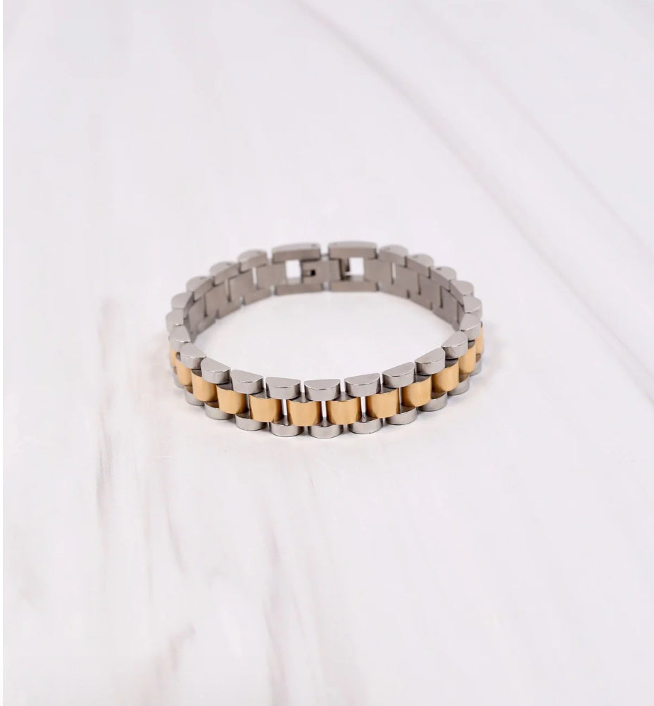 This shiny metal bracelet has a clasp closure and will be great in a full stack of bracelets. It is made with stainless steel.