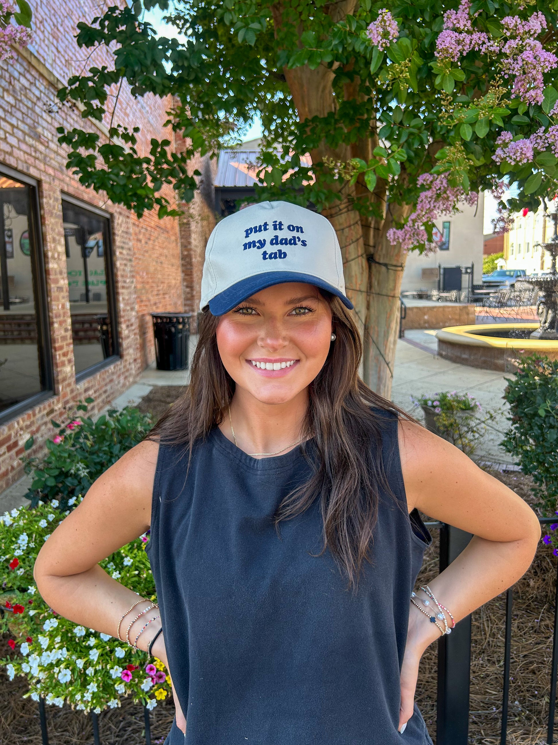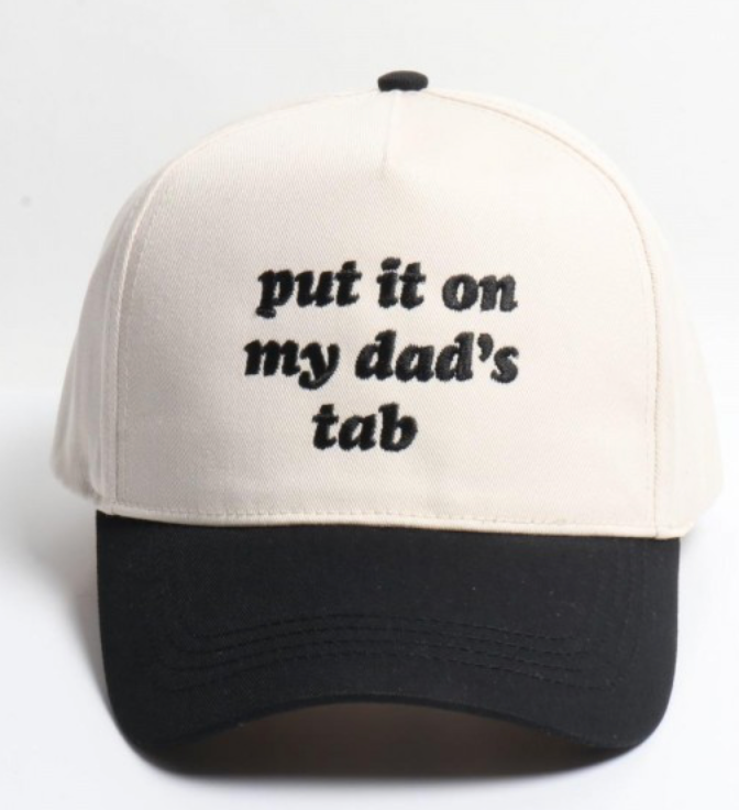 Elevate casual style with the Cursive Dad’s Tab Hat, featuring a distinctive two-tone design and expertly embroidered "put it on my dad's tab" script. This baseball cap combines classic comfort with a playful, personalized touch, making it an ideal accessory for everyday wear or gifting. Durable construction ensures long-lasting use, while the adjustable fit provides all-day comfort. Perfect for those who appreciate subtle humor and timeless style.