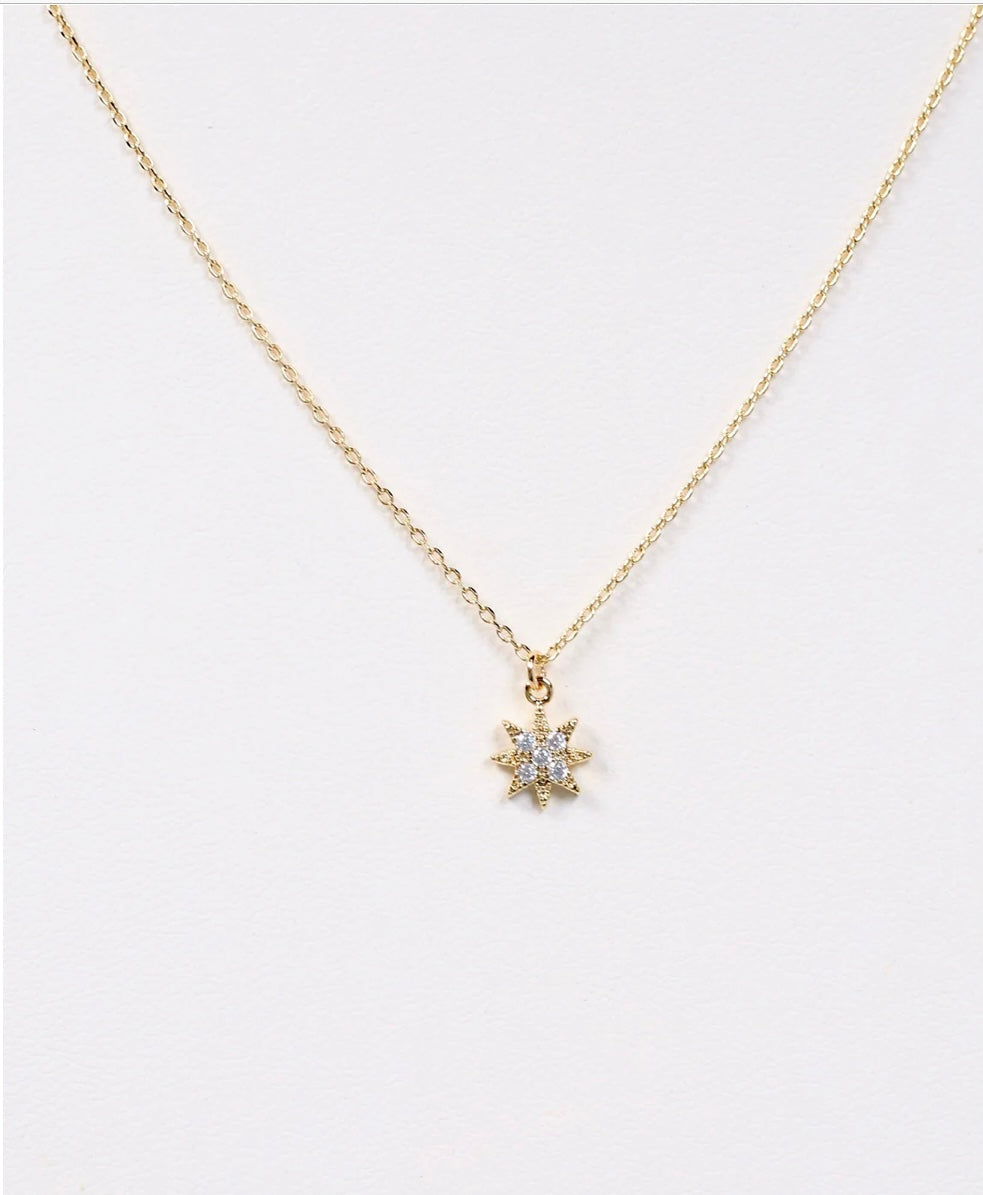 This necklace has a single sunburst charm with accent CZs. Made with brass and gold dipped.