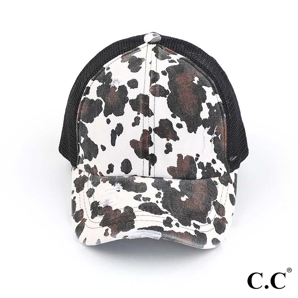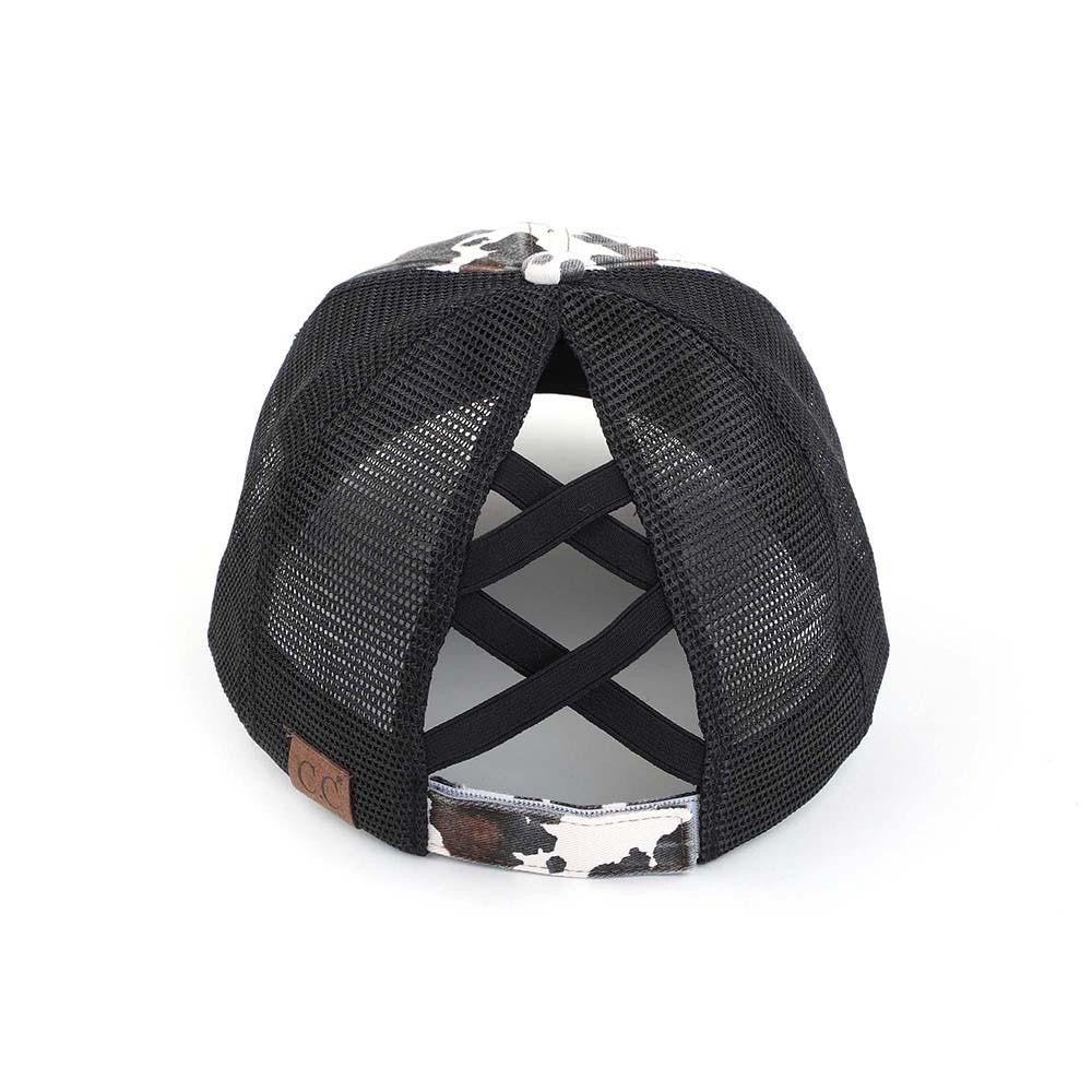Distressed Cow Print Criss Cross Pony Cap with Mesh Back