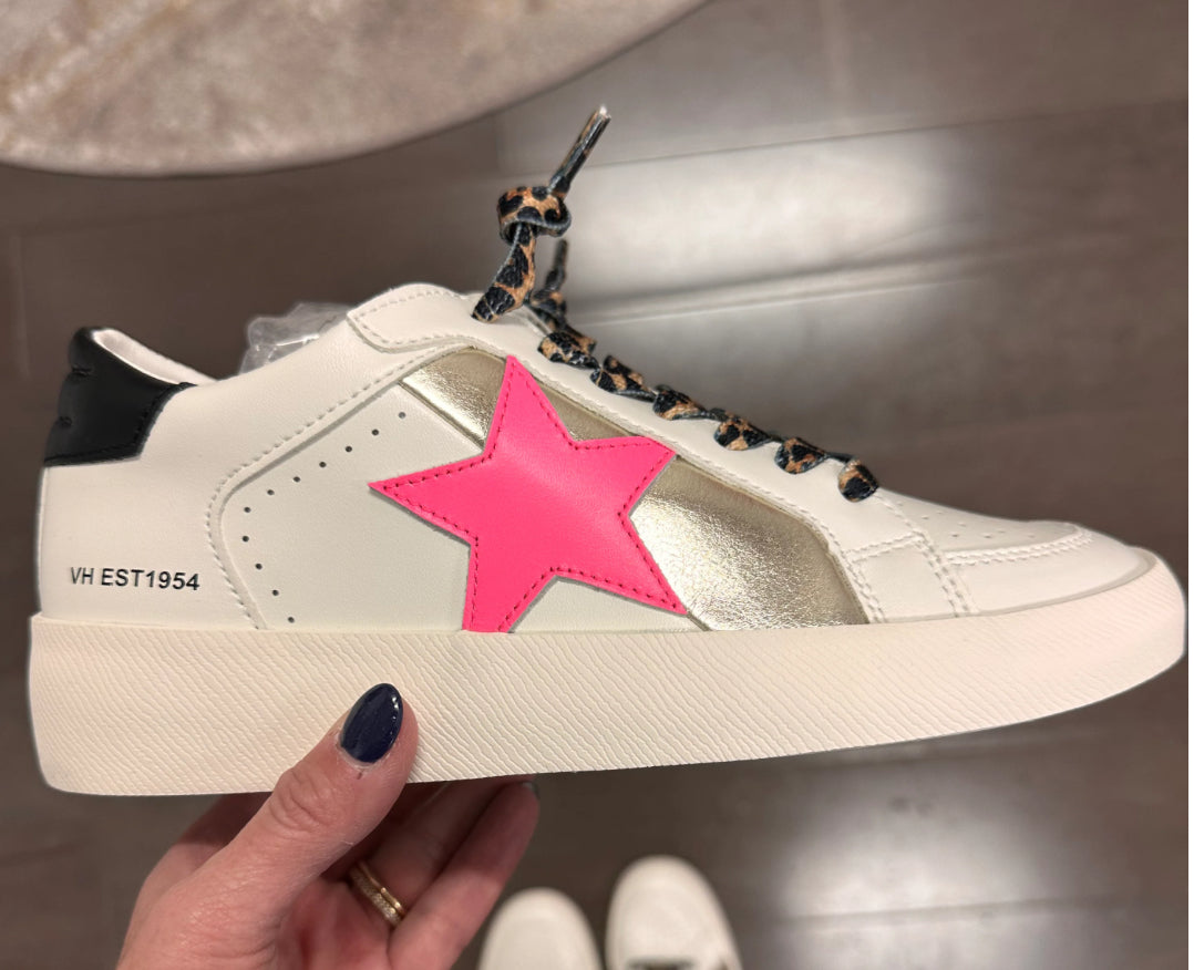 The Firecracker Sneakers are perfect for any fashionista. With their leopard shoe laces, hot pink star, and gold detail, these statement sneakers are sure to turn heads anywhere you go.