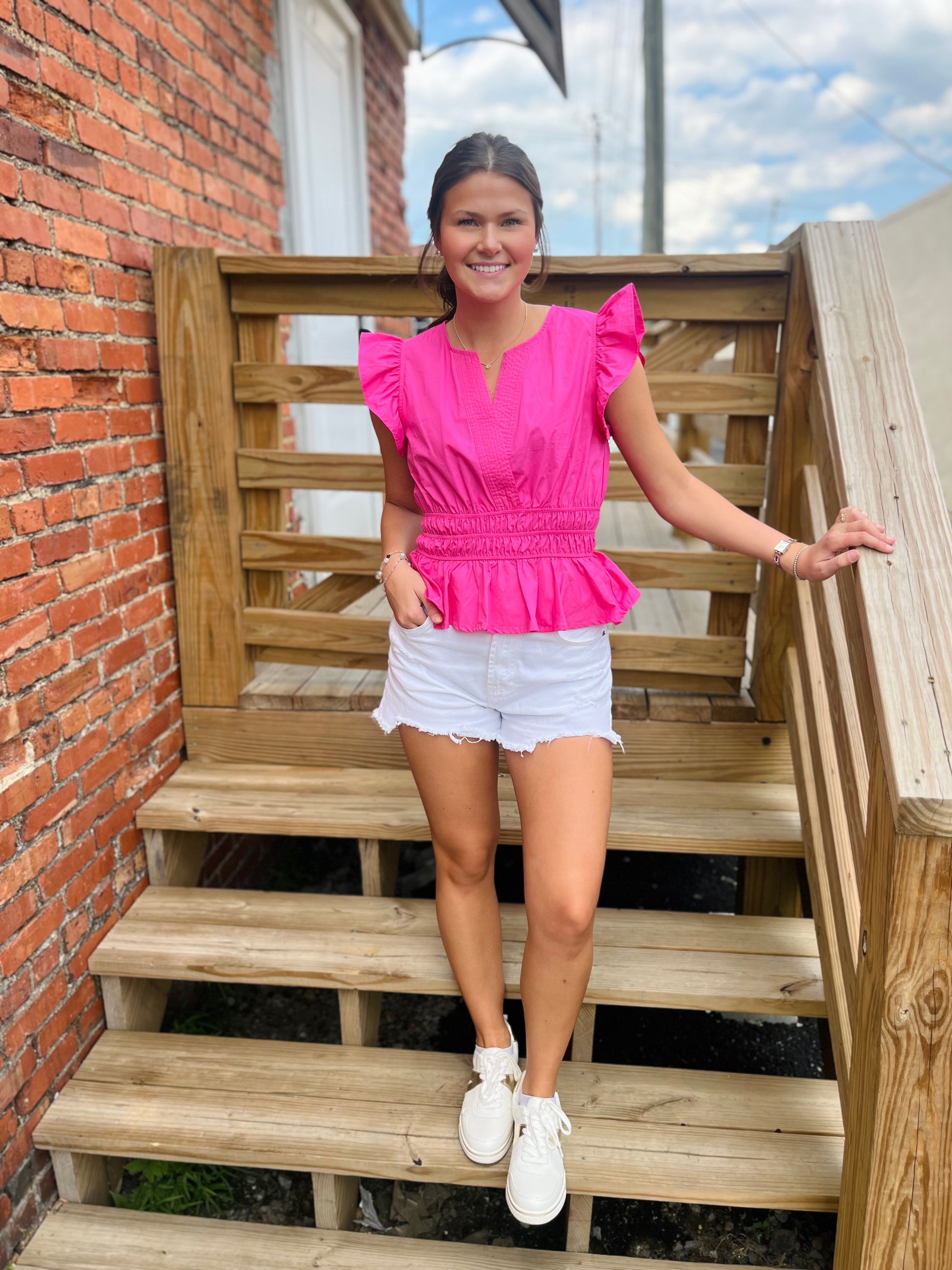 This woven top features a V-neckline, ruffled sleeves, and a waist elastic for effortless style and comfort.