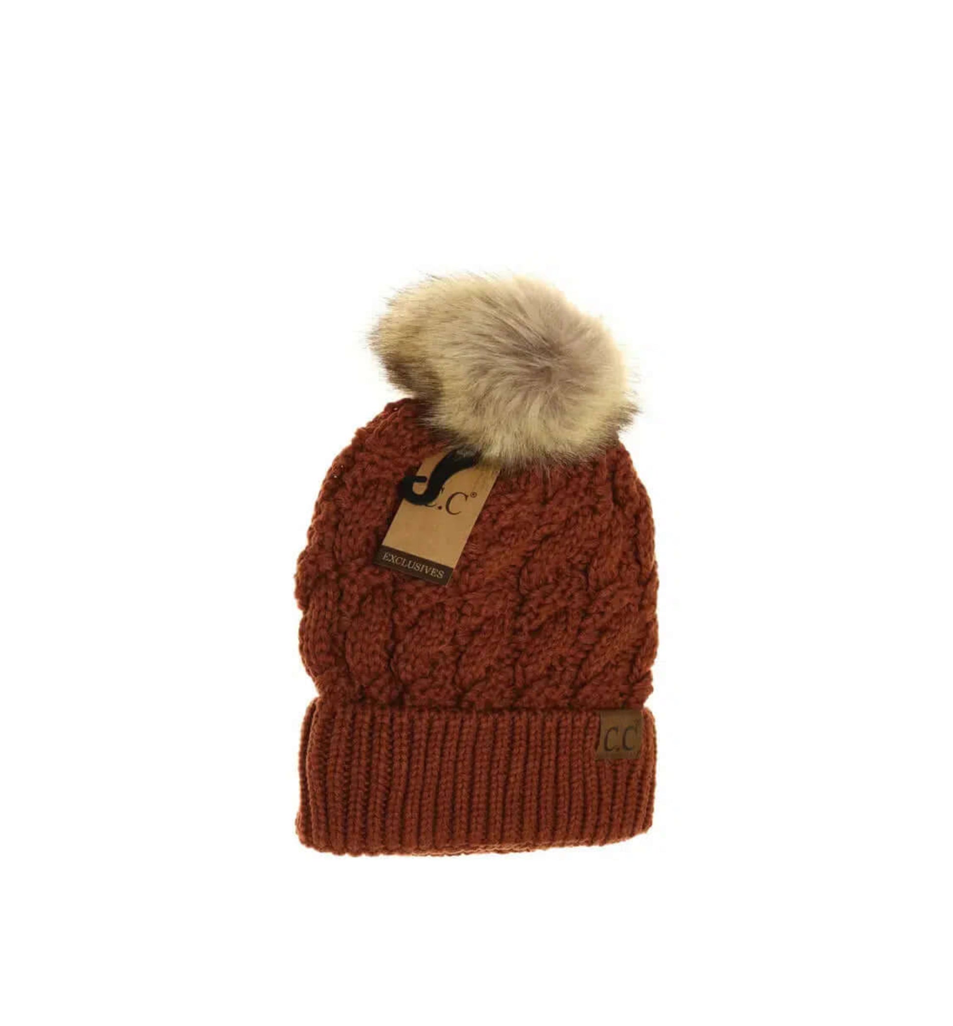 Brand new! This soft cable knit beanie is adorable with a faux fur pom to adorn the top!