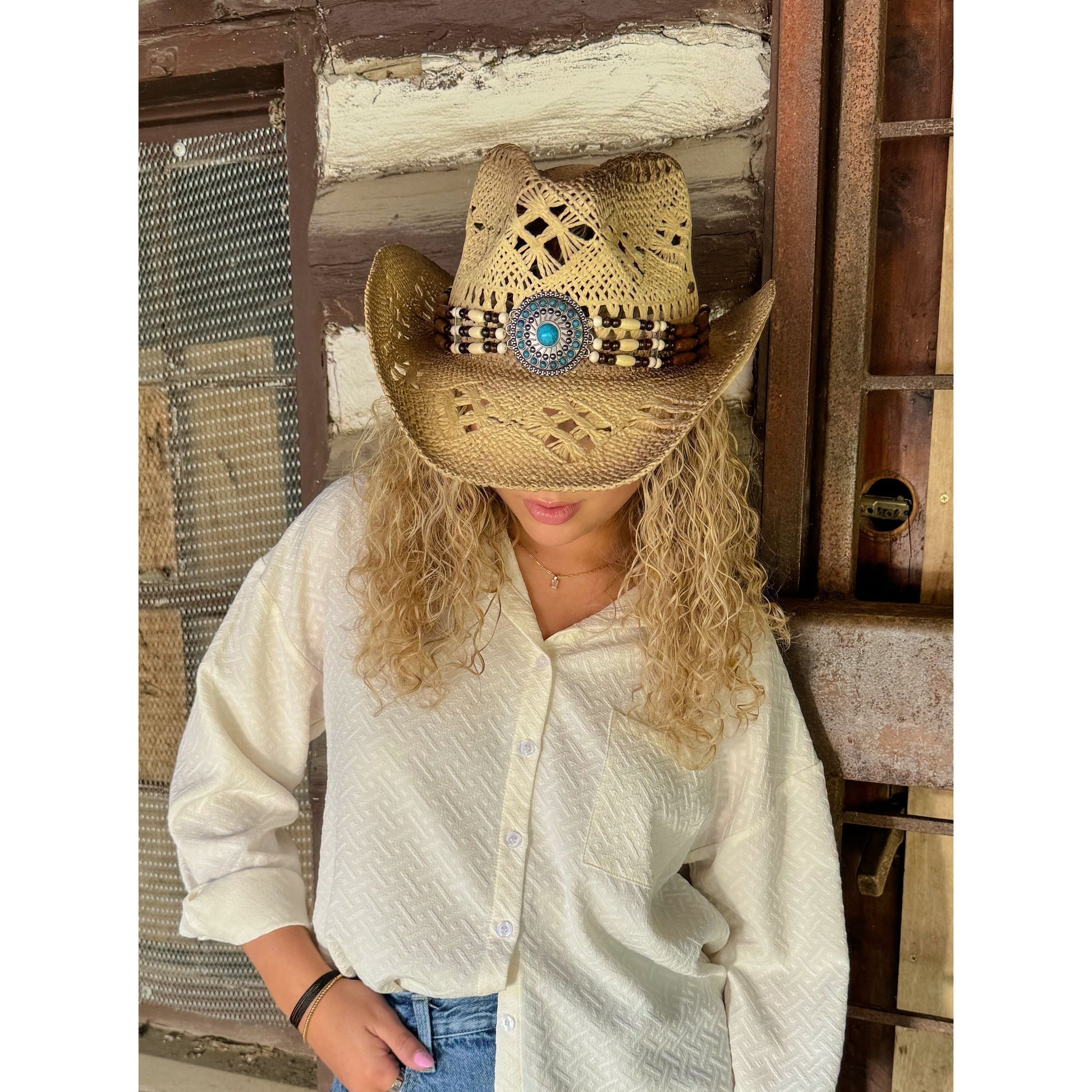 Stay cool and stylish with our woven cowboy hat. Handcrafted with tea-stained, weaved straw, this classic cowgirl accessory features a wooden bead band and a pop of turquoise. Perfect for outdoor adventures or a day at the rodeo.