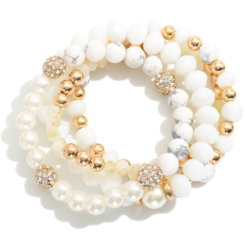 Get the ultimate arm candy with our Set Of Four Pearl & Stone Bracelets! This stunning set features beaded stretch bracelets adorned with semi-precious stones, lustrous pearls, and faceted beads. Elevate any outfit with these versatile and elegant accessories. Don't miss out!