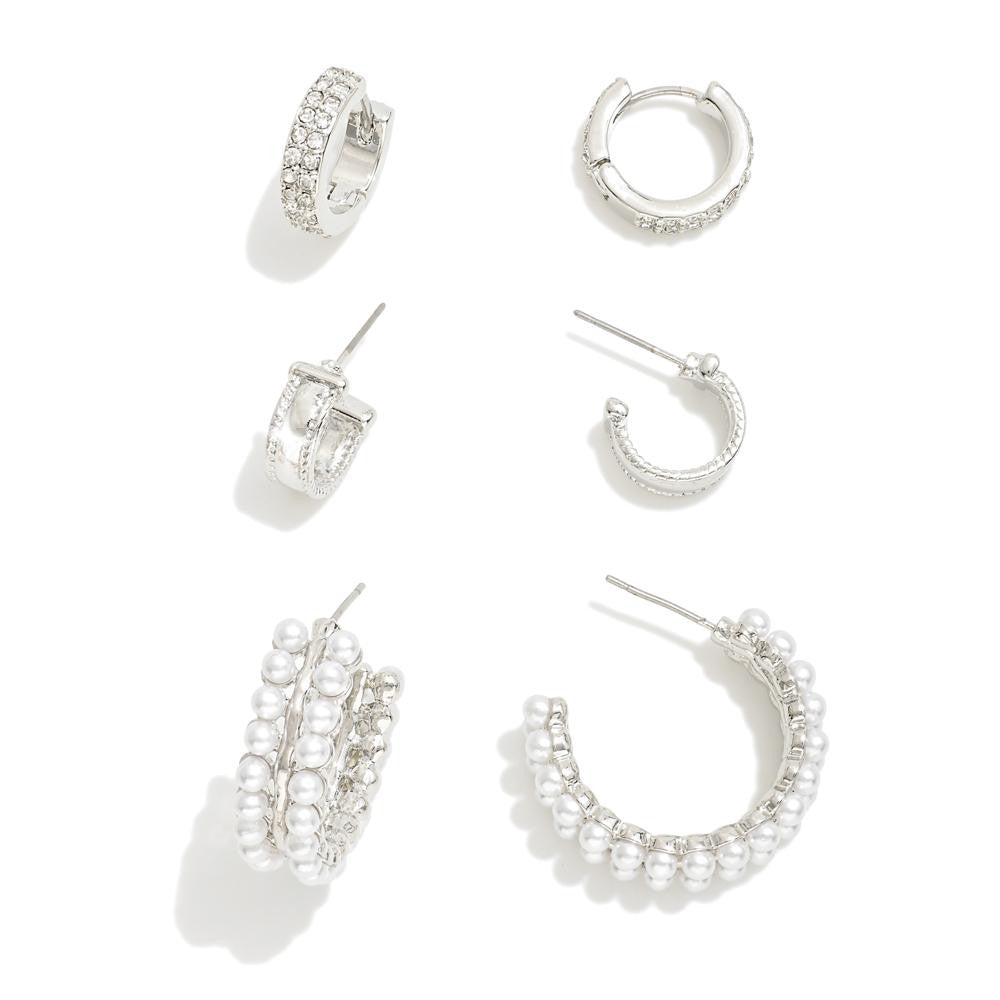 Complete your look with this playful set of three huggie hoop earrings, featuring pearl and rhinestone details. These delicate earrings add a touch of whimsy to any outfit, making them the perfect accessory for any occasion. Don't settle for plain hoops when you can have these fun and chic options!