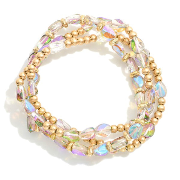 Add a touch of elegance to your wrist with our Set of Three Iridescent Crystal Bracelets. These beautiful stretch bracelets feature iridescent glass crystals that catch the light, creating a stunning and unique look. Perfect for any occasion, these bracelets make a statement and add a touch of sparkle to any outfit.