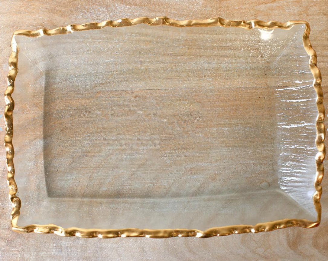 Rectangular shaped glass serving tray with subtle bubble accents and metallic gold border. We like using this as a serving piece for entertaining, or keeping jewelry organized!