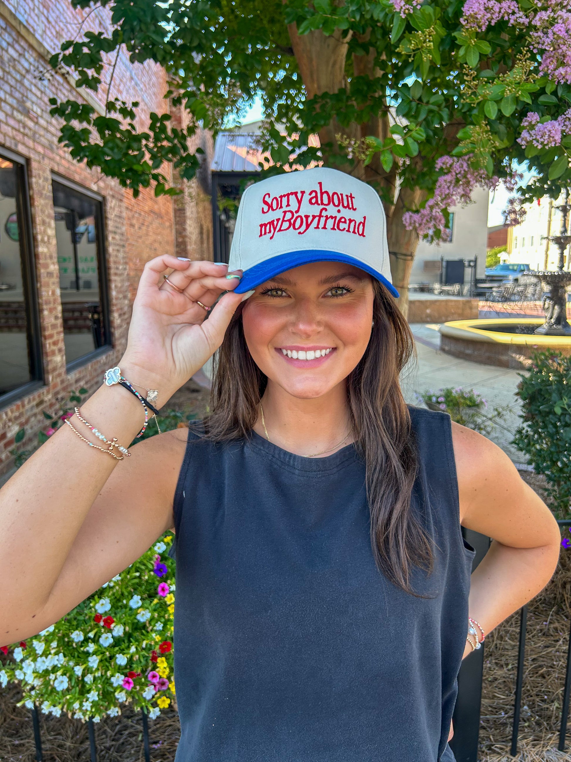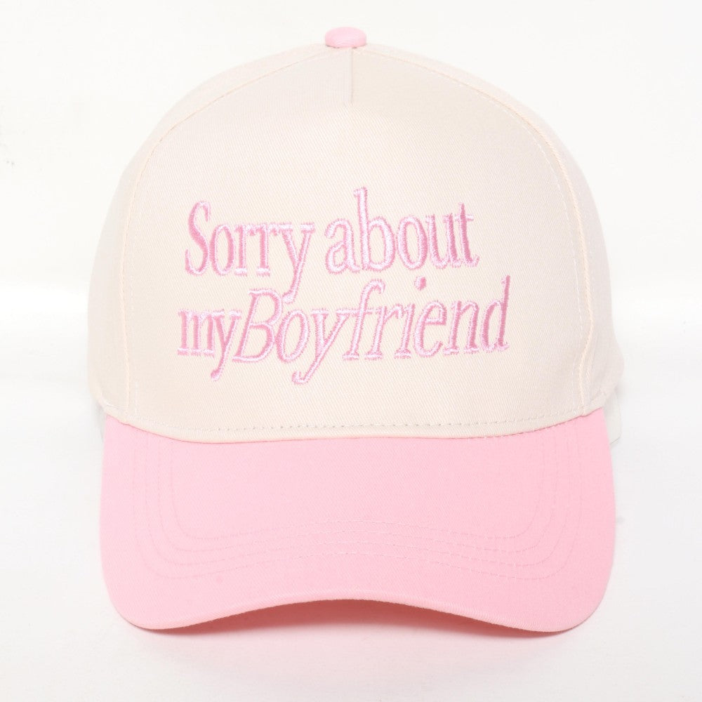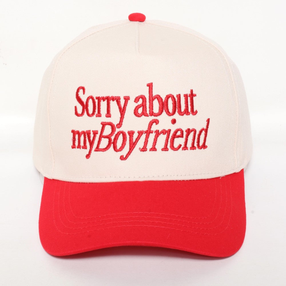 This two-tone baseball cap features the playful embroidered phrase "Sorry about my Boyfriend," blending casual style with a touch of humor. Crafted for comfort and durability, it’s an ideal accessory to add personality to your everyday look while providing reliable sun protection. Perfect for those who appreciate witty fashion statements with a classic sporty edge.