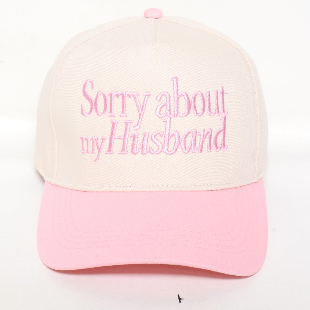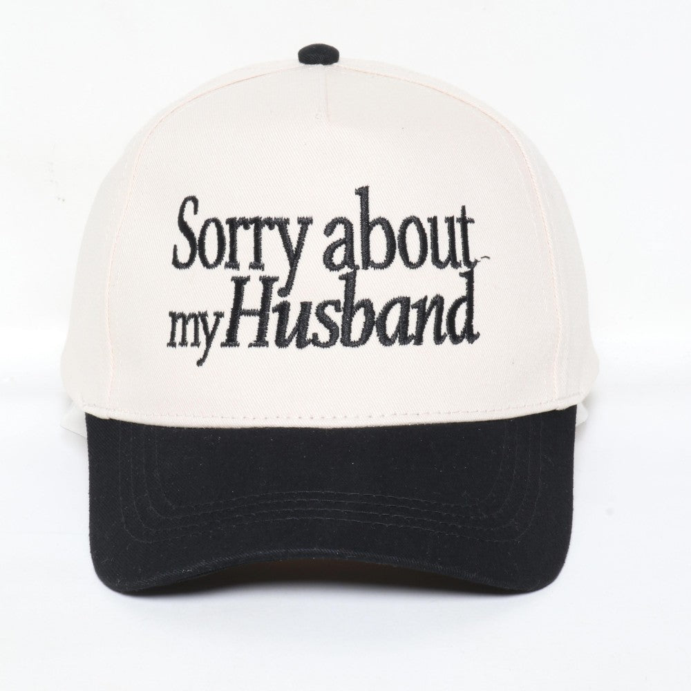 This two-tone baseball cap features the embroidered phrase "Sorry About My Husband," blending casual style with a touch of humor. Crafted for comfort and durability, it offers an adjustable fit suitable for everyday wear. Perfect for adding personality to your outfit while keeping the sun at bay.