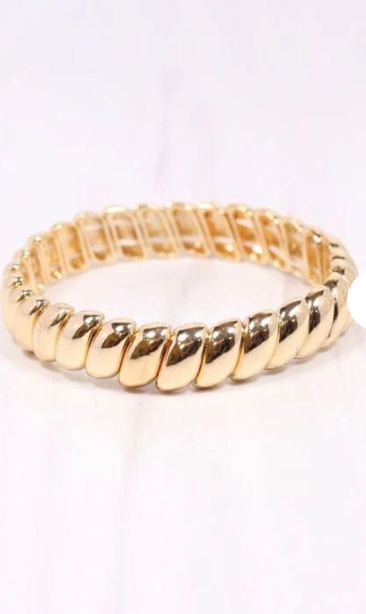 This metal bracelet has a shiny finish and is a wonderful piece to wear casually or dress up. It has a classic look to it and stretches to fit most wrists.