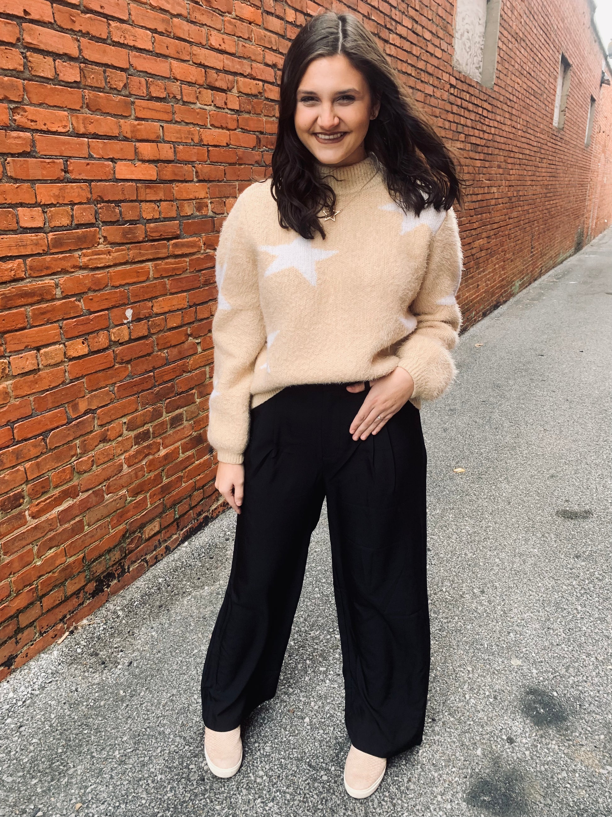 Straight leg pants with a button front closure and pockets. Flowy and relaxed look. Inseam: 30”. 95% polyester, 5% spandex