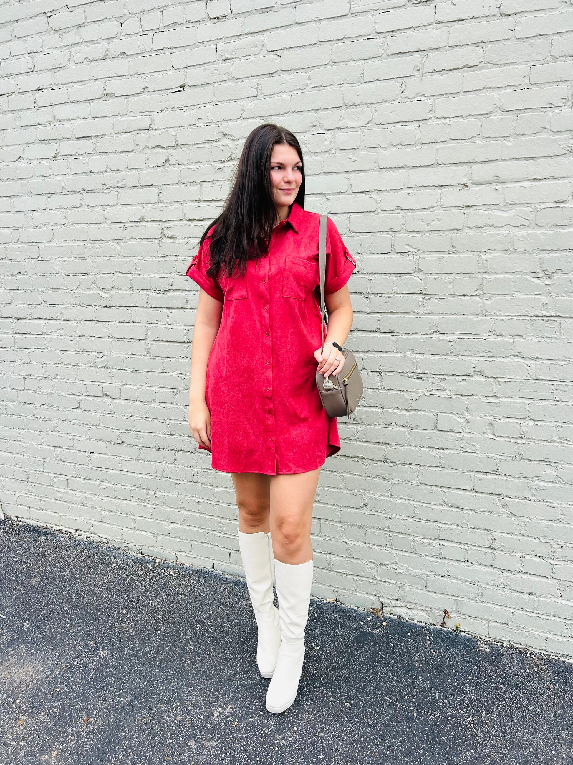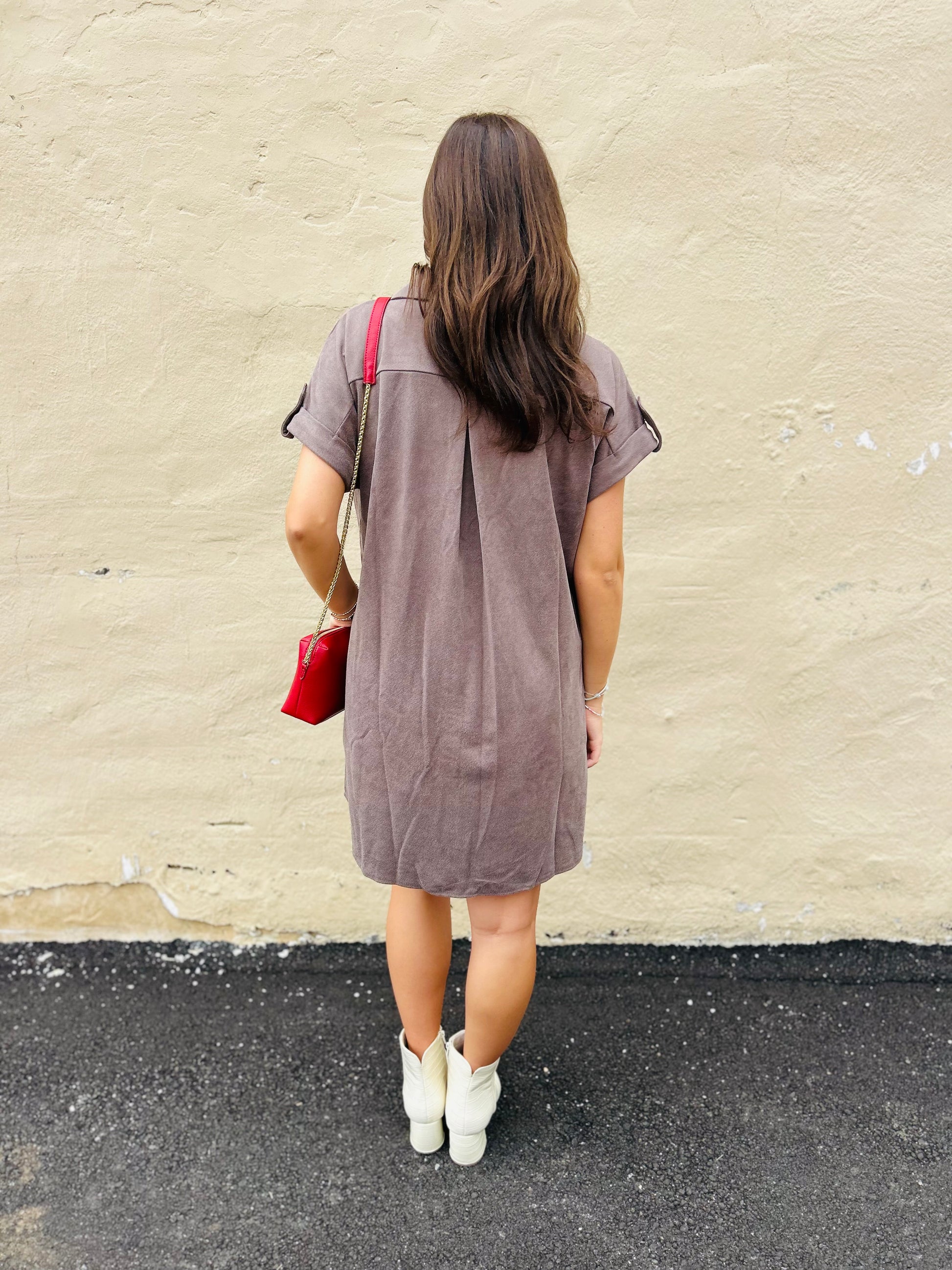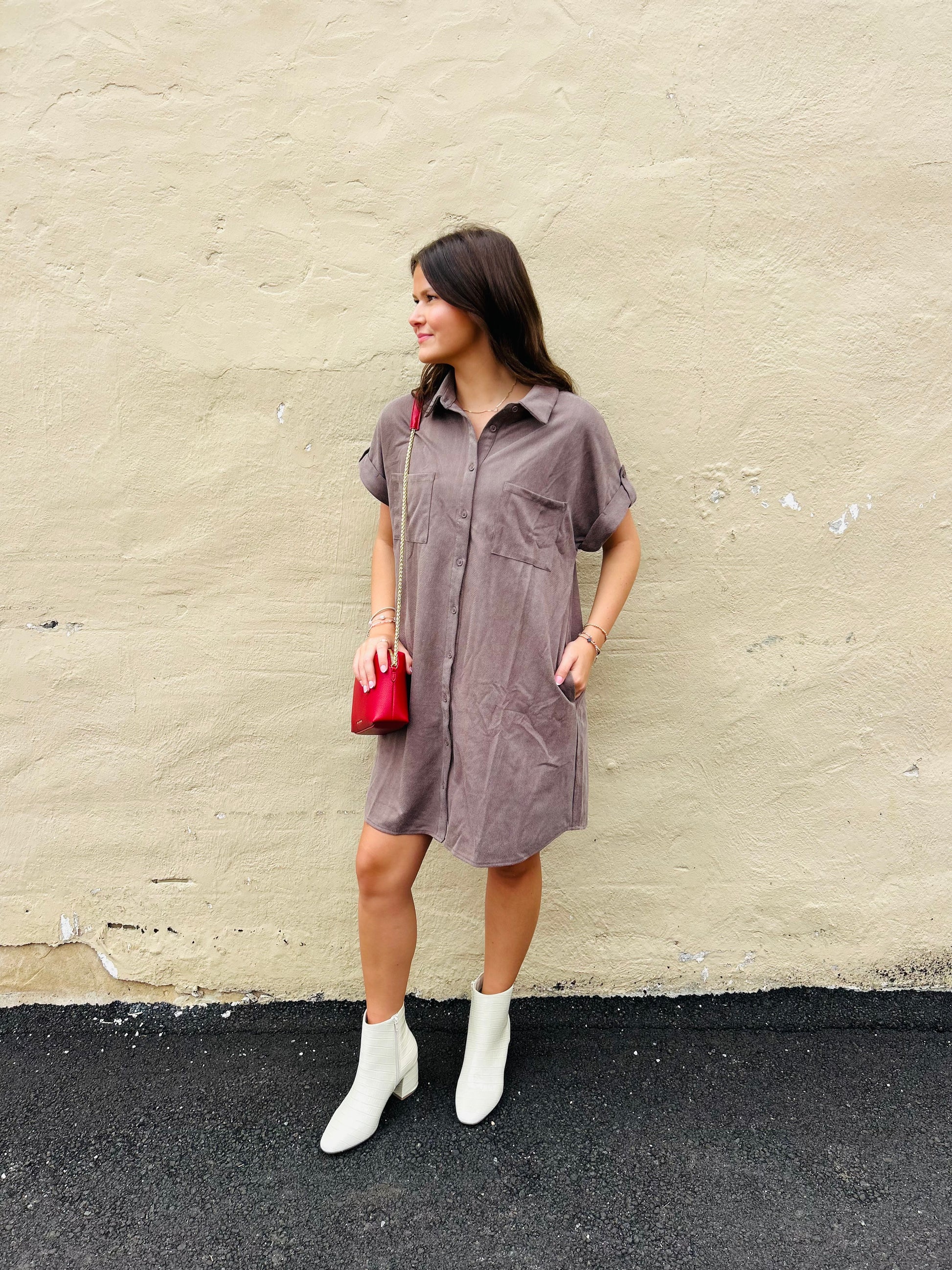 Crafted from luxurious suede fabric, this button up shirt dress is a true wardrobe essential. The addition of pockets adds functionality and convenience, while the soft fabric offers both comfort and style. Perfect for any occasion, this dress is a must-have for the fashion-forward individual.