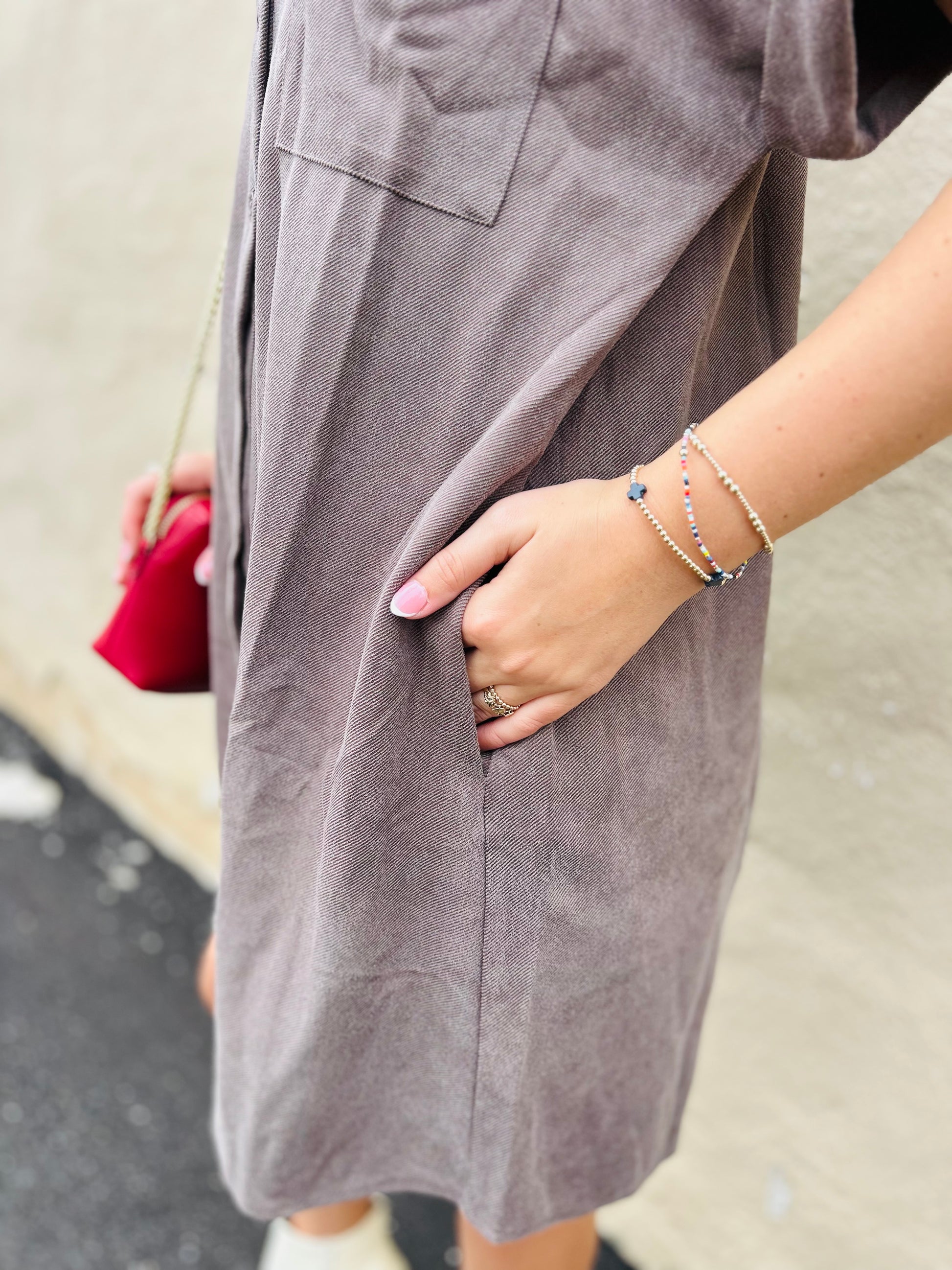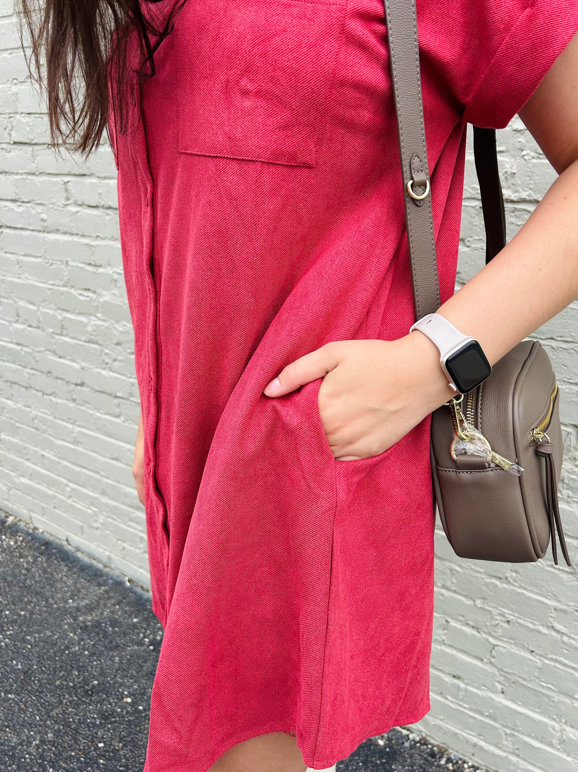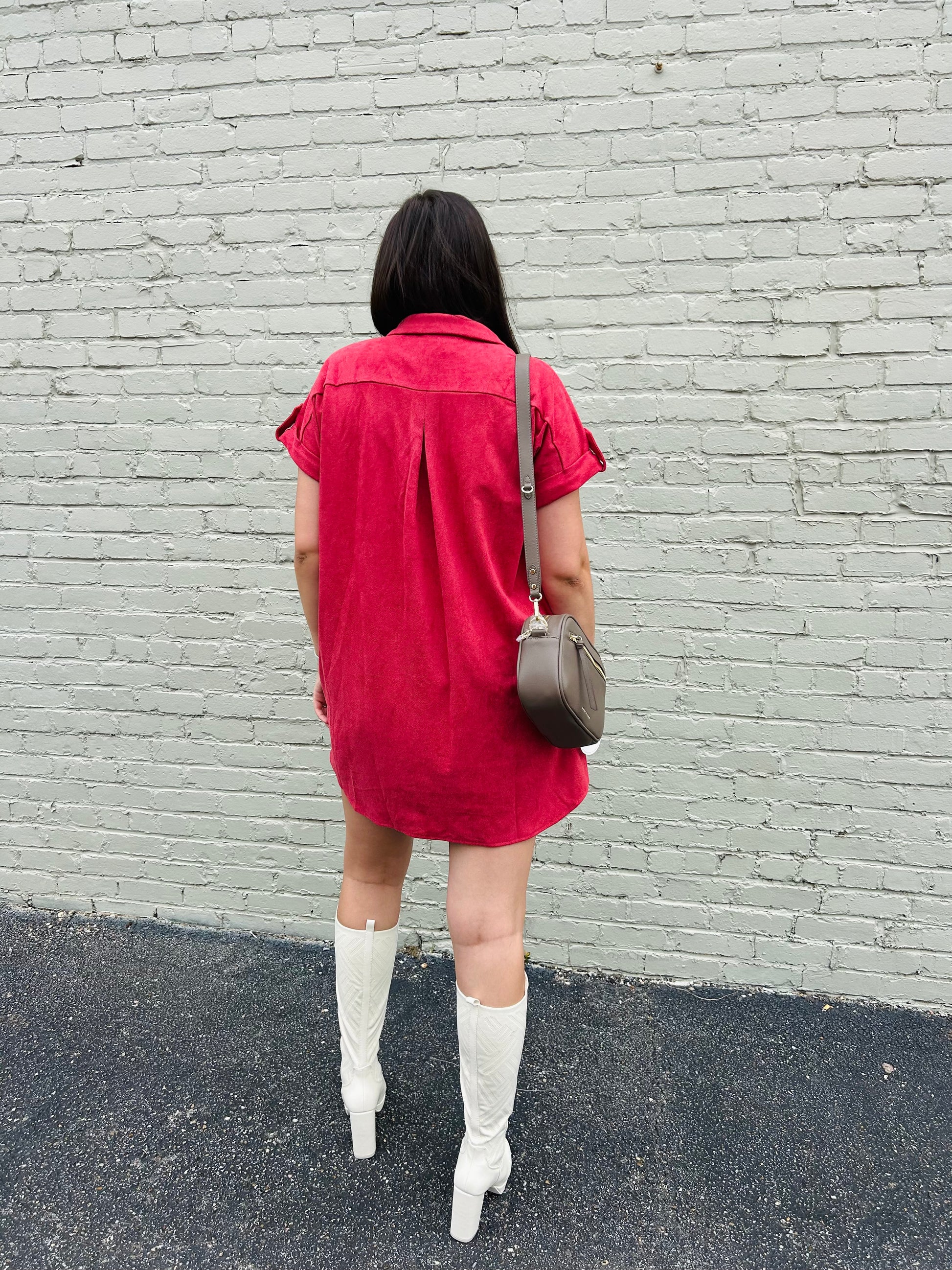 Crafted from luxurious suede fabric, this button up shirt dress is a true wardrobe essential. The addition of pockets adds functionality and convenience, while the soft fabric offers both comfort and style. Perfect for any occasion, this dress is a must-have for the fashion-forward individual.