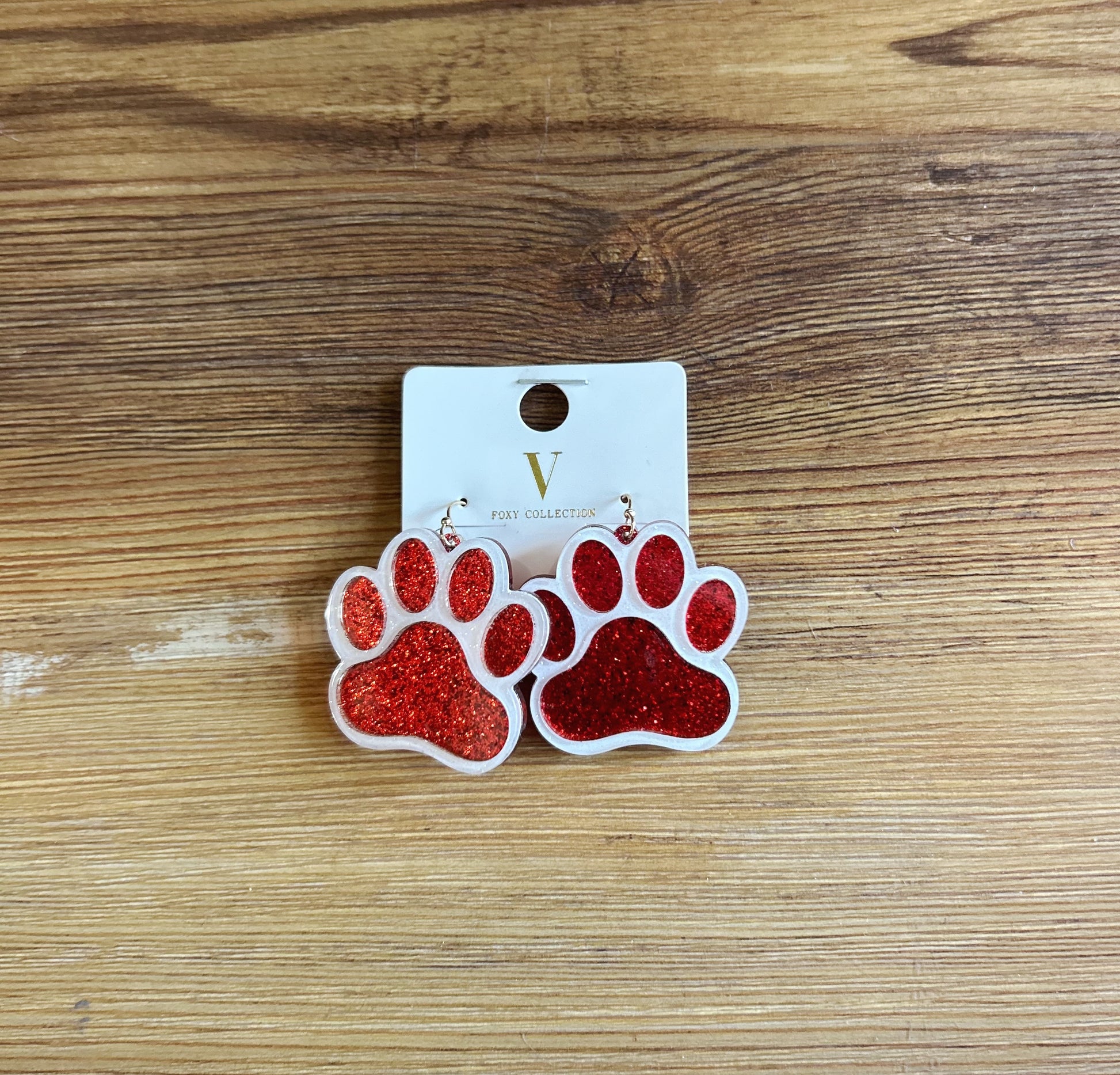 Orange matte Tiger paw earrings with Royal blue glitter outline. Red glitter Tiger paw earrings with white matte outline. These earrings are perfect for game days and will definitely be the talk of the stadium!
