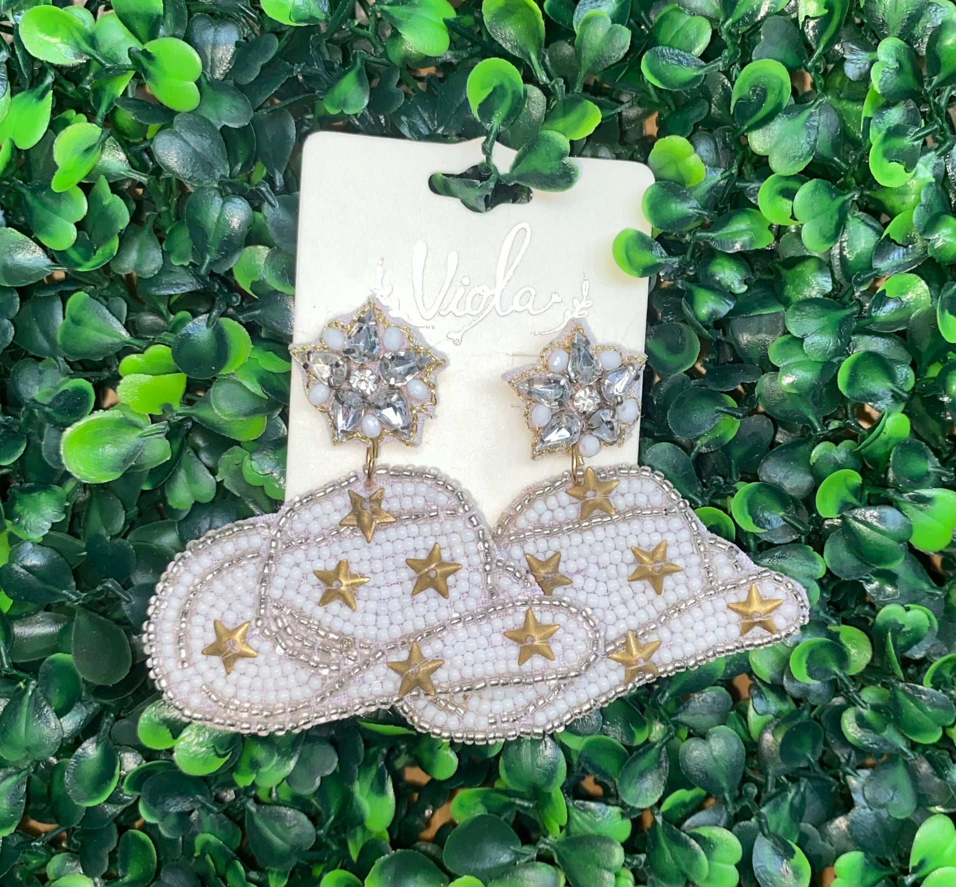 Add a touch of western charm to any look with these beautiful gold-star beaded cowboy earrings. The white beaded detailing adds an understated yet sophisticated feel. These earrings are sure to be a conversation starter, perfect for any occasion.