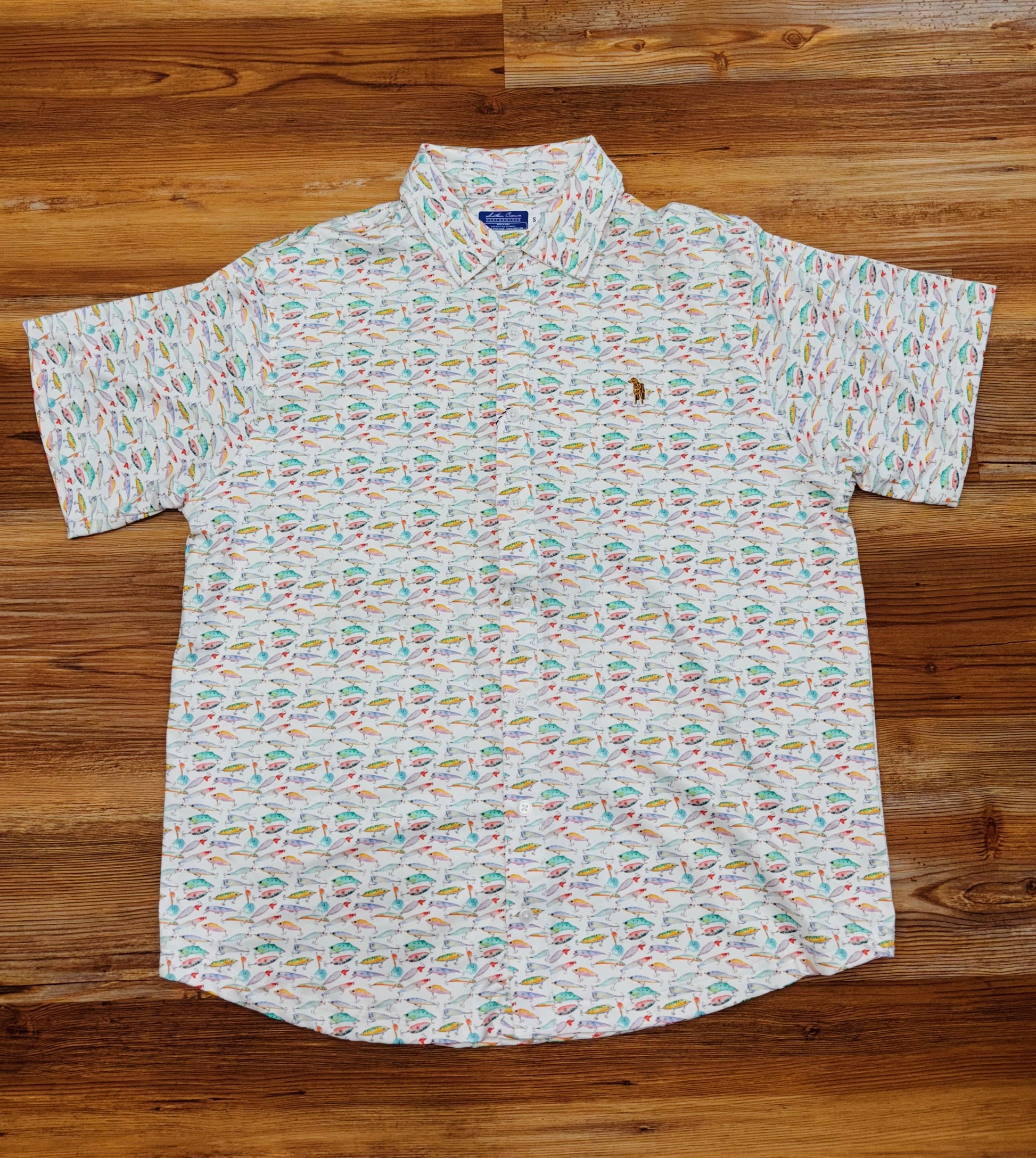 "The Watercolor Lures Polo is a stylish and functional addition to your wardrobe. With colorful lures that add a touch of personality, this button down polo is perfect for any outdoor excursion. Expertly crafted with a professional tone, it's a must-have for the avid angler."
