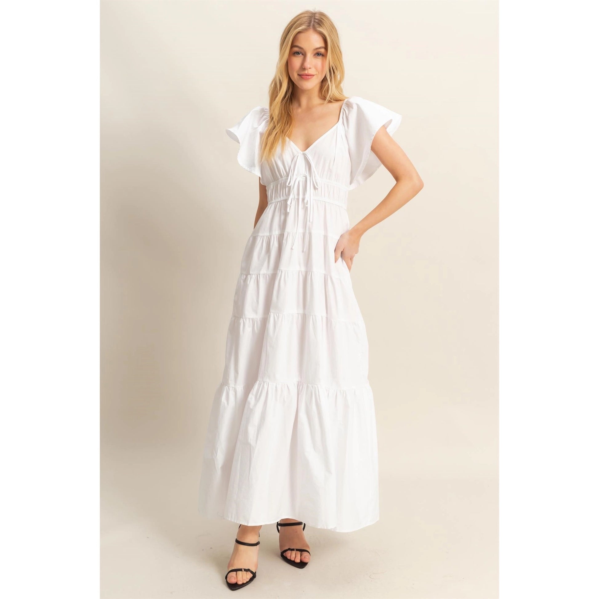 This white dress features elegant ties in front, adding a touch of sophistication to your wardrobe. Expertly crafted from high-quality fabric, it offers a comfortable and flattering fit. Perfect for any occasion, this dress is a versatile addition to your collection.