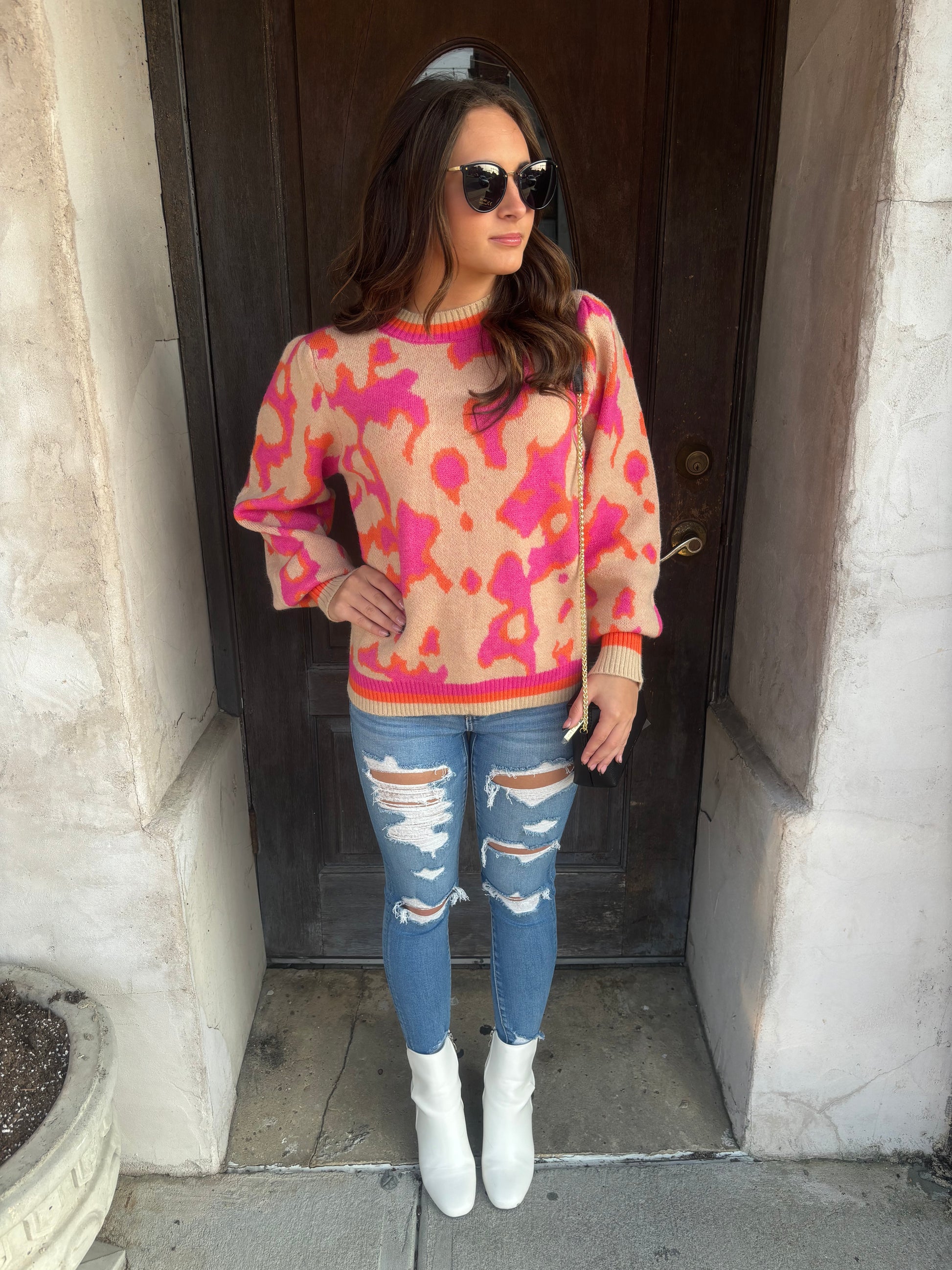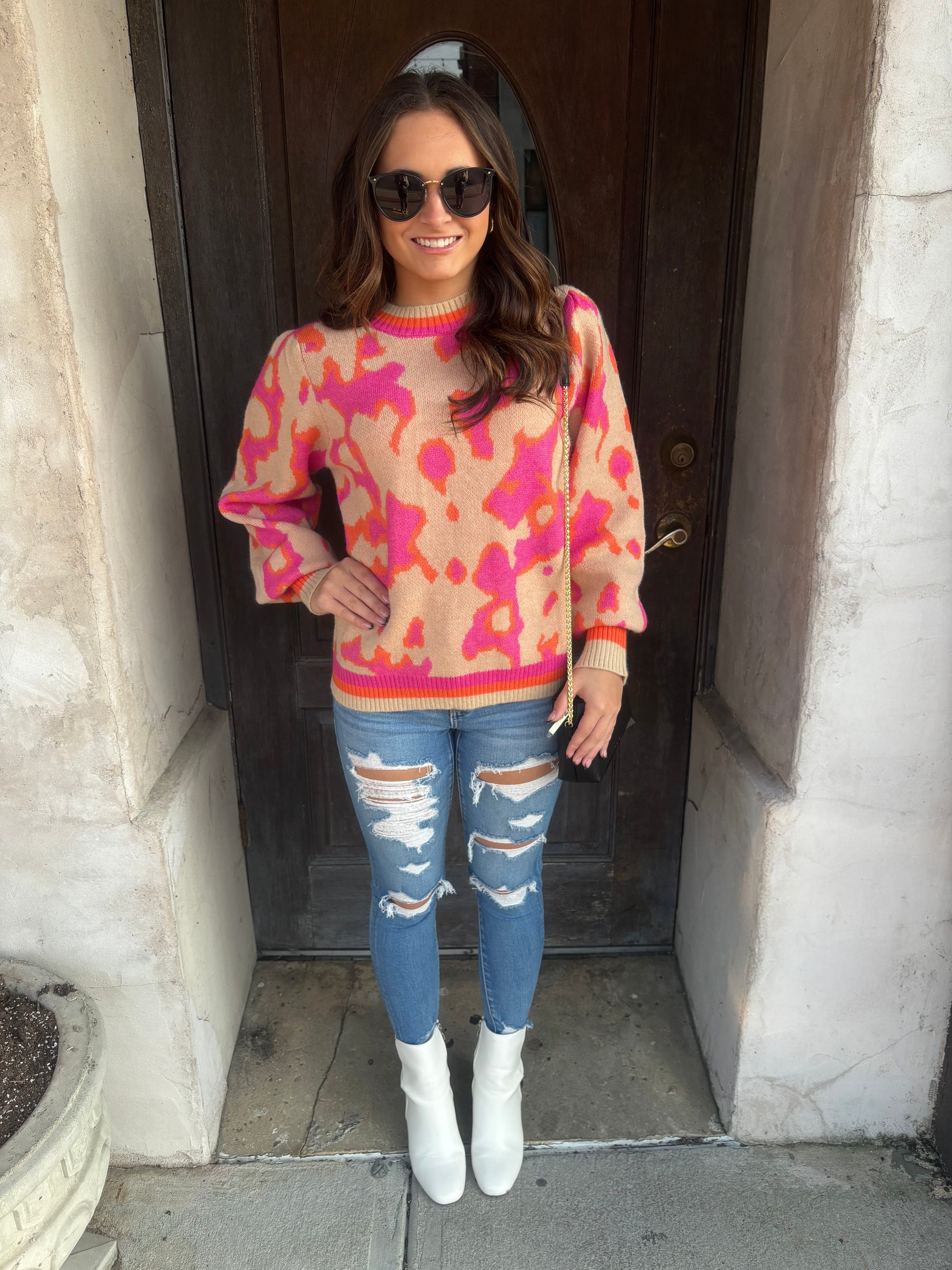 Upgrade your wardrobe with the stylish and bold Wild Cheetah Sweater. Featuring a playful combination of orange and pink, this sweater will make a fierce statement wherever you go. Made with high-quality materials, this sweater is both comfortable and eye-catching, perfect for any fashion-forward individual.